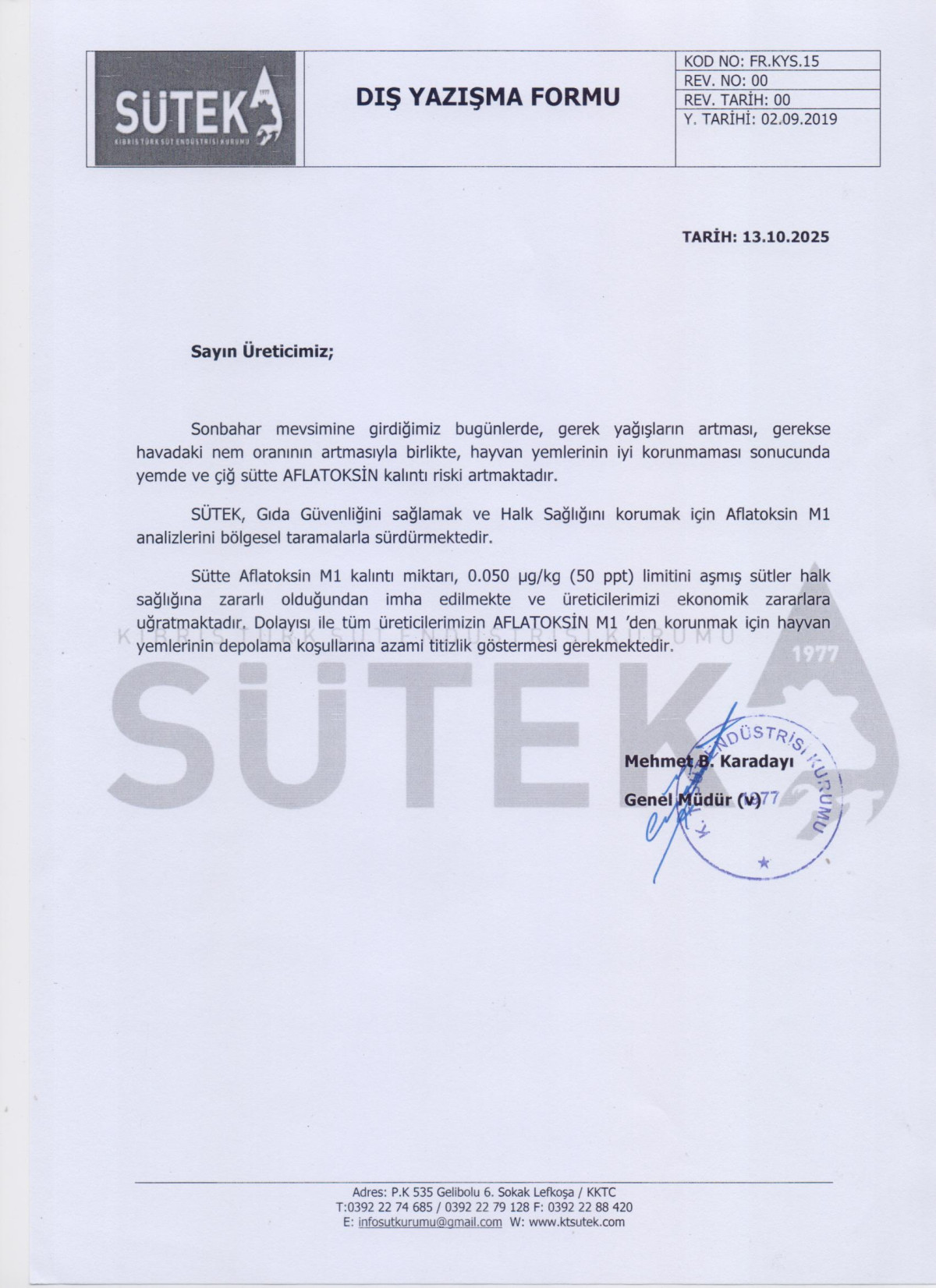 ÜRETİCİ BİLGİLENDİRME (AFLATOKSİN M1) Tweet Bu kategorideki diğerleri: « SÜT BEDELLERİ ÖDENİYOR ( 16 - 31 / AĞUSTOS / 2025 )