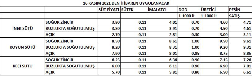 ÇİĞ SÜT FİYATLARI BELİRLENDİ. SÜTEK Yönetim Kurulu 11 Kasım 2021 tarihinde yapmış olduğu toplantıda, 16/11/2021 tarihinden itibaren çiğ süt fiyatlarının aşağıdaki şekilde uygulanmasına karar vermiştir. Tweet Bu kategorideki diğerleri: « SÜT BEDELLERİ ÖDENİYOR (16 - 30 / EYLÜL / 2021) SÜT BEDELLERİ ÖDENİYOR (01 - 15 / EKİM / 2021) »